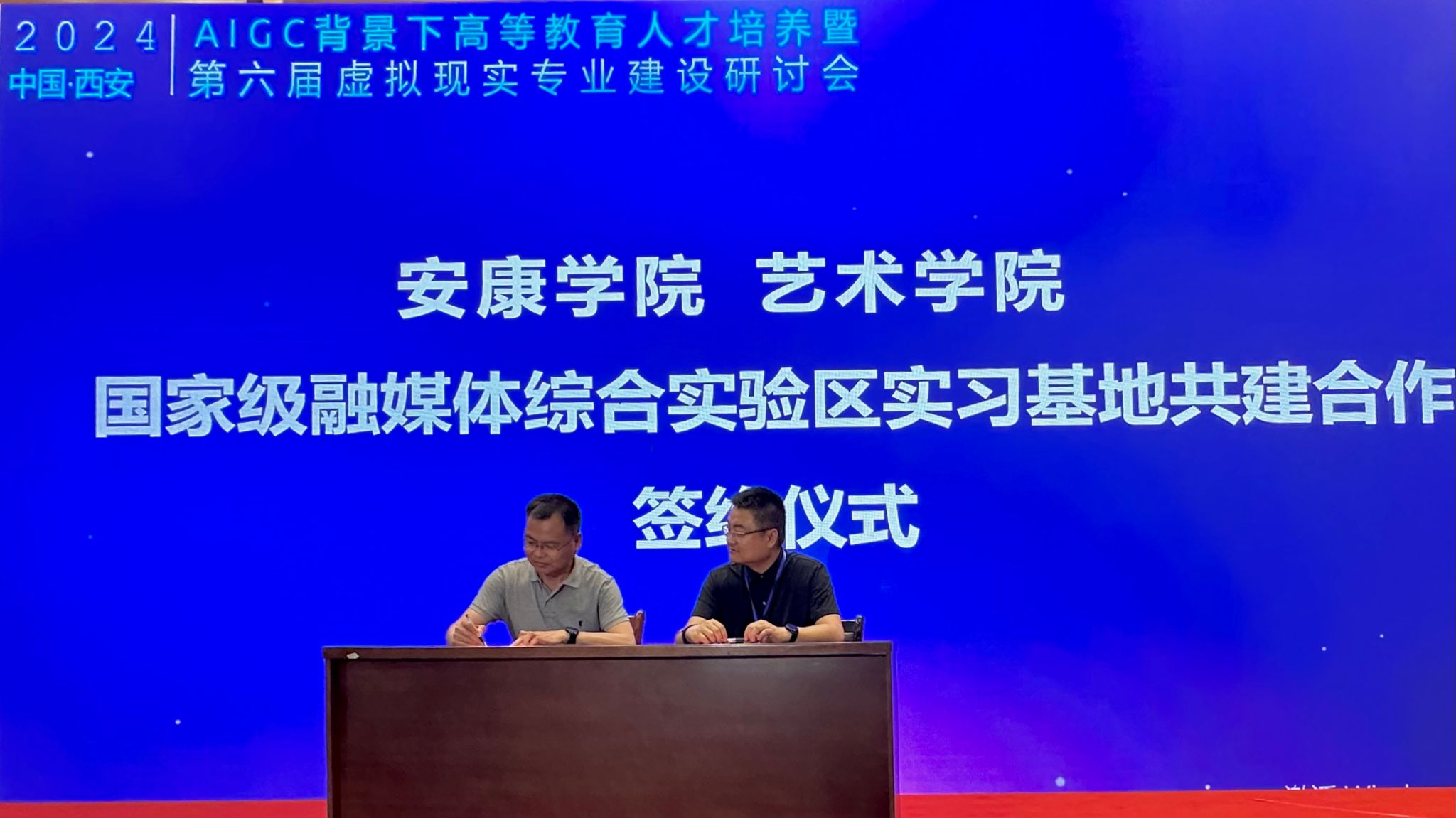 会议以“AIGC技术背景下高等教育人才培养”为主题,研讨虚拟现实技术专业课程体系、专业课程教学、实验教学及综合实践训练等相关建设工作。在会议上进行了万象城awcsport官网国家级融媒体综合实验区实习基地合作共建协议签约仪式,成党伟代表学院签约。