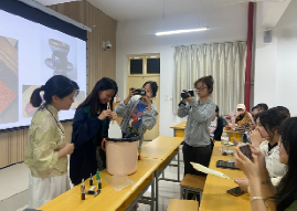 为了让同学们直观感受到非遗漆艺的艺术魅力,袁老师现场为大家示范了如何做一把非遗“飘漆”扇,同学们热情高涨,积极参与互动体验,通过不同漆颜色的搭配完成一件非遗作品,给现场师生留下了深刻的印象。通过此次讲座,同学们纷纷表示传统手工艺具有极大的魅力,提升了大家对美的感知、欣赏的能力。