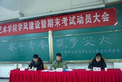 院学工办主任刘泽桢老师做学风建设及期末考试动员讲话。刘老师就学风建设提出三点建议:一是做好自己的学业、职业规划,凡事预则立,不预则废;二是要学会学习,艺术类学生学习要靠“悟”与“练”,要有兴趣、下功夫、使巧劲;三是要建立良好的学习氛围,抓好两个课堂,向第一课堂要效率,积极参加第二课堂,做到“以赛促学”,发挥班团干部带头作用,在同学之间开展比、学、赶、帮、超活动。最后,刘老师就期末考试考风考纪向同学们提出严格要求。刘老师强调万象城官网对考试违纪行为零容忍,他希望全体学生都能够端正考风,严肃考纪,营造文明、诚信考试。