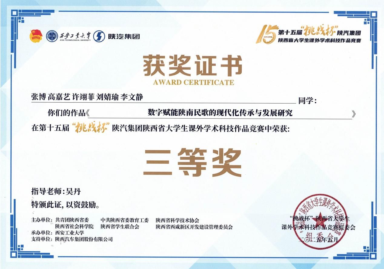 近日,由团省委、省委教育工委、省科协、省社科院、省学联与省西咸新区管委会联合主办、西安工业大学承办的第十五届“挑战杯”陕汽集团陕西省大学生课外学术科技作品竞赛落下帷幕。我院黄小荣、李秀春和吴丹老师指导的宋闫嘉、张博等学生在竞赛中表现优异,分别斩获二等奖、三等奖,展现出扎实的学术素养与创新能力。