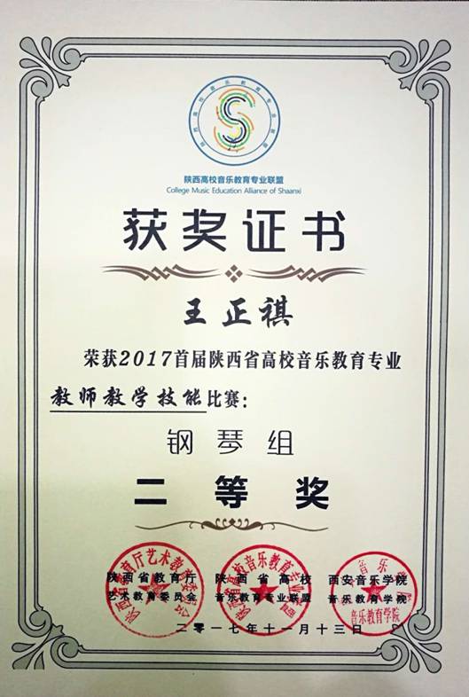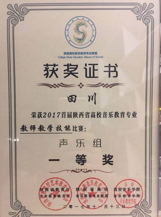 11月13日,万象城官网田川、王正祺老师在陕西省教育厅艺术教育委员会主办、西安音乐学院音乐教育学院承办的“2017首届陕西省高校音乐学专业教师教学技能比赛”中分获声乐组一等奖和钢琴组二等奖,体现了万象城官网音乐专业教师在全省高校中良好专业素质和教学能力。