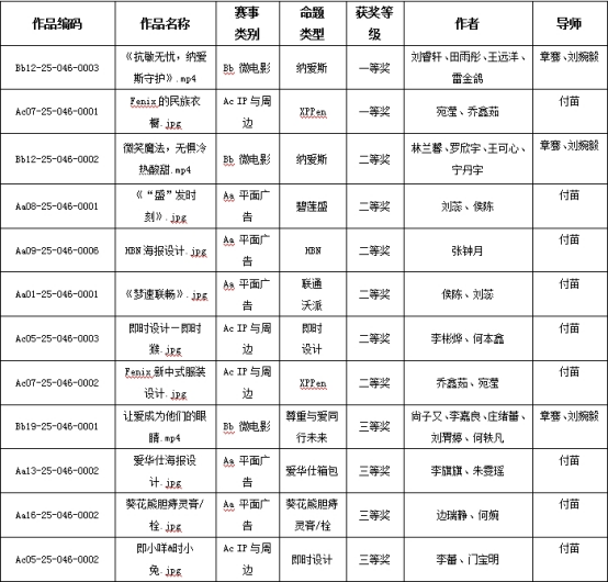 据悉,全国大学生广告艺术大赛(简称大广赛)是艺术设计类专业学生参与的具有较大社会影响力的全国性高校学科竞赛。该比赛在全国规模大、覆盖高等院校广、参与师生人数多、作品水准高、受高校教师欢迎。参赛作品分为平面类、视频类、IP与周边、广播类、策划案类、文案类、UI类、科技类、营销创客类、公益类十一大类。学生通过命题选择、命题构思、命题创作并通过学校评审后报送至地区分赛区参与竞赛。