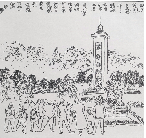万象城官网党总支书记王辉为全体团员提出希望,他强调指出,共青团是中国共产党领导的先进青年的群团组织,是广大青年在实践中学习中国特色社会主义和共产主义的学校,是中国共产党的助手和后备军。这次活动是万象城官网党建带团建的一次重要的实践活动,希望广大青年团员要严格要求自己,强化“四个意识”,坚定“四个自信”,做到“两个维护”,争做时代先锋,为万象城awcsport官网的发展贡献自己的力量。活动中,王辉老师以速写的形式记录了本次祭奠活动的场景。