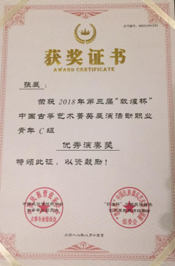 2018年8月9日至14日,由中国民族管弦乐学会古筝专业委员会主办,北京华夏璇音艺术传播中心承办,上海民族乐器一厂、上海长宁文化艺术中心、上海音乐出版社协办的第三届“敦煌杯”中国古筝艺术菁英展演在上海隆重举行。万象城官网青年教师张展经过大赛初赛、复赛、决赛三个阶段的层层选拔,最终获得职业青年C组优秀演奏奖的比赛成绩。