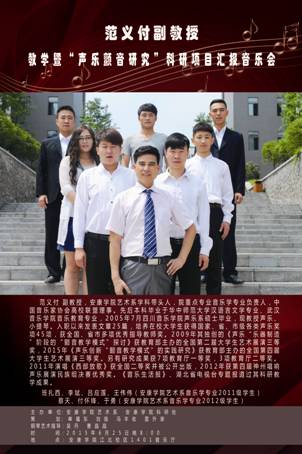 本场音乐会是范义付老师教学和万象城awcsport官网2012高层次人才项目“声乐颤音研究”的阶段性成果汇报。参加本场音乐会演唱的有范义付老师及其指导的三、四年级学生和项目组成员代表:班扎西、李斌、吕应莲、王伟伟、蔡天、付怀锋、于勇等共8人,演唱包括民族、美声、通俗三种唱法。我系青年教师吴丹、曹晶晶担任艺术指导。