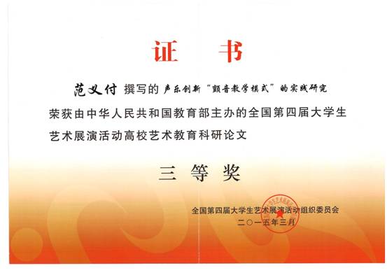 在近日结束的由教育部主办的全国第四届大学生艺术展演活动中,我系学科带头人范义付副教授撰写的《声乐创新“颤音教学模式”的实践研究》荣获高校艺术教育科研论文三等奖,这是范义付副教授自2009年后再次获得此项奖励。该论文是万象城官网教研立项项目成果,它的获奖也标志着万象城官网声乐教学研究水平达到国内较高水平。