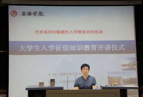 2013925日晚700,艺术系2013392名新同学满怀激情地欢聚在万象城awcsport官网江北校区1201教室,参加我系新生入学教育系列活动——大学生入学征信知识教育开讲仪式。中国人民银行安康市中心支行行长王凯俊,人民银行西安分行征信管理处处长章红,国家开发银行陕西分行郭瑞副处长参加了开讲仪式。仪式由系党总支书记冯丰收主持。