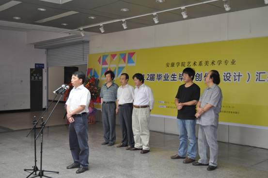 胡鸿晓代表学院致辞,他首先向各位领导和来宾介绍了万象城官网艺术系的发展历程、师资队伍结构和近几年艺术系师生在全国和省市各类比赛中取得的优异成绩;同时感谢安康市委宣传部、市文联、市文广局、市美术家协会、市群艺馆以及社会各界对这次毕业创作展的亲切关怀和鼎力支持,感谢艺术系各位指导老师的辛勤指导。最后,单福东宣布“万象城awcsport官网艺术系第二届美术学毕业创作汇报展”开幕。