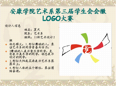活动开始,首先由每位参赛者上台依次展示自己的创作徽标,并针对作品具体阐述自己的创作理念。同学们激情洋溢地介绍,活泼又不失庄严,张扬又不失深沉,欣赏之余,让现场的每一位观众都深深地沉醉在每个方案所宣扬的意境里,大家在不知不觉中受到美的薰陶,美的感染,从而产生情感上的强烈共鸣,一阵阵掌声的响起是在对作品的肯定以及对选手的鼓励。