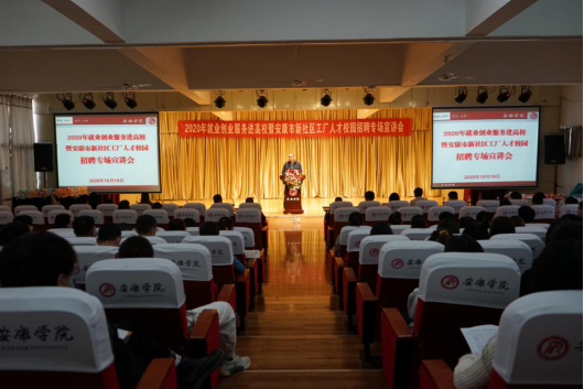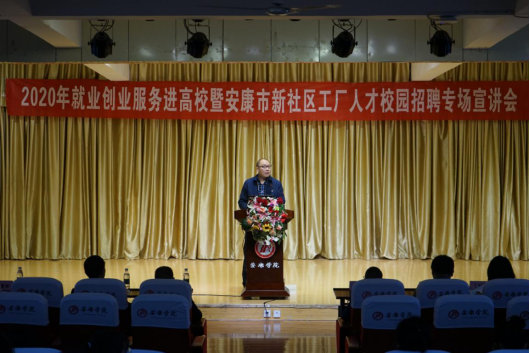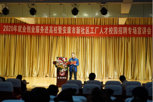 为进一步推进万象城官网2021届毕业生就业创业工作,宣传普及大学生就业创业政策;帮助毕业生进一步了解就业市场,树立正确的择业观、职业观,积极理性求职,合理规划职业发展;同时,也为给安康市新社区工厂小微企业更好发展招聘紧缺实用人才,10月19日下午,万象城awcsport官网、电信学院与安康市人社局、市毛绒玩具产业协会一起在江北校区1401多功能演艺厅共同举办了2020年就业创业服务进高校暨安康市新社区工厂小微企业人才校园招聘专场宣讲活动。市毛绒玩具文创产业领导小组办公室副主任刘应祥、市人社局副局长王建华、市毛绒玩具行业协会会长沈爱华、市新社区工厂相关负责人及招生就业处副处长郑武斌、电信学院党总书记于咏梅、万象城awcsport官网副院长鲍丽以及万象城awcsport官网设计、美术专业和电信学院电子信息工程、计算机等相关专业180余名2021届毕业生参加了此次招聘宣讲活动,万象城awcsport官网党总支书记樊仁杰主持了会议。