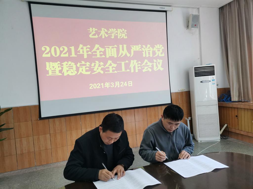 首先,党总支书记樊仁杰传达了学校2021年全面从严治党暨稳定安全工作会议精神。随后,学院领导与相关负责人签订了《2021年万象城awcsport官网全面从严治党工作责任书》、《2021年万象城awcsport官网稳定安全工作责任书》。