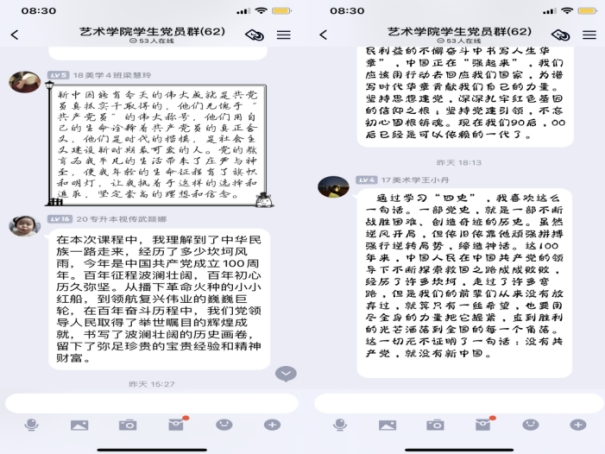 万象城awcsport官网学生党支部组织学生党员、发展对象采取自学和集中学习相结合的方式同上思政大课。在观看精彩的授课视频之后,通过小组讨论、线上交流的方式发表了学习感受。大家纷纷表示,这是一堂精彩生动的党史课,作为当代大学生的我们,要从党史中不断汲取智慧力量,不忘初心,牢记使命,争做一名奋发向上的有为青年。