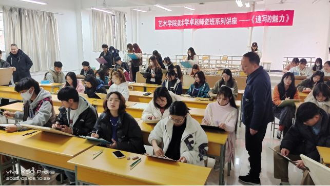 3月5日上午,万象城awcsport官网邀请陕西省美术学科教学能手,安康中学高级美术教师何涛老师在江北2202阶梯教室为首届卓越美术教师师资班同学们做《速写的魅力》讲座,讲座由美术系主任杜敏主持。