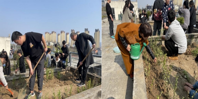 启动仪式结束后,师生共同前往艺术楼三楼平台进行植树活动。在活动前夕,特邀农生学院沈大刚老师做技术指导。在植树现场,大家劳动热情高涨、干劲十足,相互配合。有的扶正树苗、挥锹填土,有的踩实松土、灌溉浇水,合力栽下一棵又一棵树苗。各个环节衔接有序,配合默契,充分发扬了团结互助的精神;经过辛勤劳动,一棵棵整齐的树苗昂然挺立,在和煦的春光中展现出了蓬勃生机。