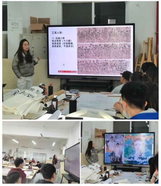 首先,谢老师通过课堂提问了解学生对《工笔人物》前期学习效果,对前期传统作品临摹过程中存在问题进行分析,提出了有效可行的解决办法。随后,谢老师从现代工笔人物的绘画特点、用线用色、肌理皴擦、特效处理、当代名家等方面进行了详细的讲解和示范。在最后的讲解过程中,谢老师指出人民大会堂接待外宾宴会厅中陈列有十余幅现代工笔人物作品,每两年一届的国家艺术基金中有30%的作品都是工笔人物作品,从思政角度说明工笔人物画在国家文化建设、重大历史题材绘画中承担着举足轻重的作用。
