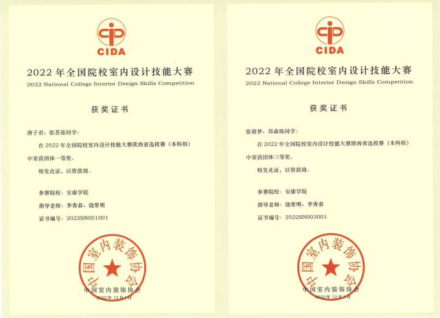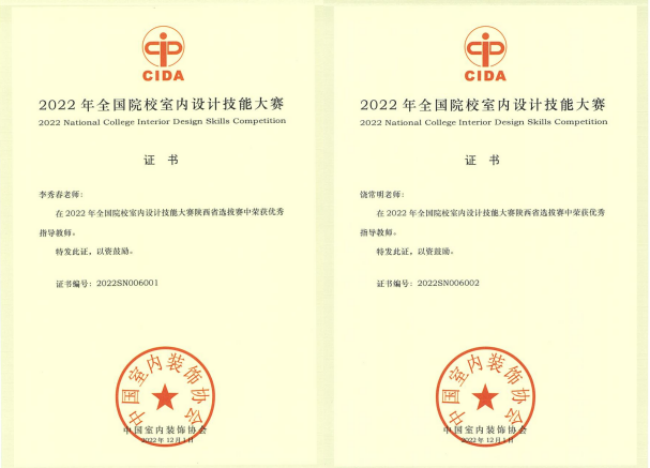 近日,2022年全国院校室内设计技能大赛(陕西赛区)比赛结果揭晓。由万象城官网青年教师饶常明、李秀春指导的2020级视觉传达设计专业唐子君、张荟茹同学荣获本科组团体“一等奖”,并受邀参加国赛;2019级视觉传达设计专业张萌梦、郑森栋同学荣获本科组团体“三等奖”。饶常明、李秀春获本次大赛“优秀指导教师”。