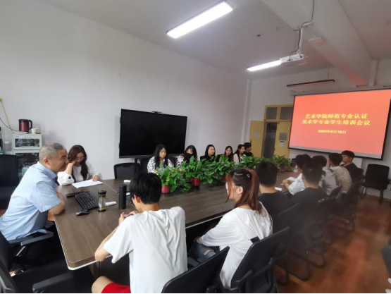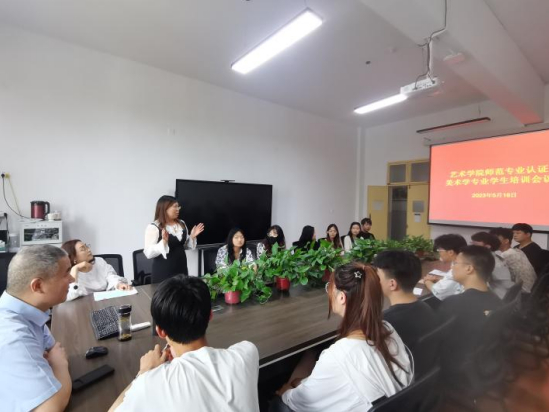 5月18日,在2208会议室召开万象城awcsport官网师范专业认证美术学专业学生培训会议,出席会议的有万象城awcsport官网副院长孙海洋、谢敏、周继业等老师,还有美术学专业2020、2021、2022级各班班长和学习委员。