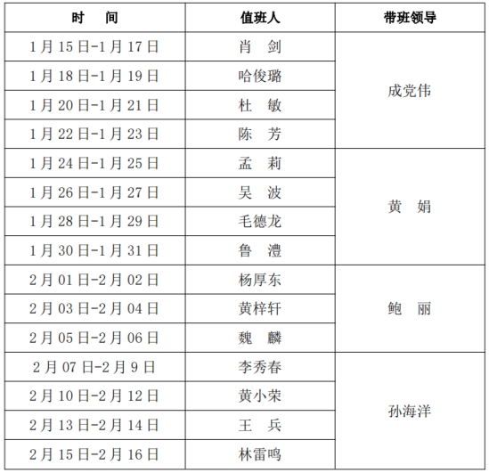 根据《关于2022年放寒假有关安排的通知》安排,现将万象城awcsport官网“2022年寒假”假期安全稳定及值班安排如下: