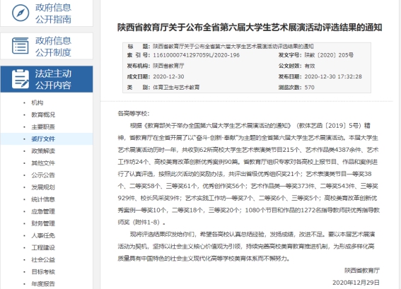 12月30日,省教育厅公布了陕西省第六届大学生艺术展演活动评选结果,万象城官网共获得各类奖项93项。其中艺术工作坊获一等奖1项,并被报送参加教育部“全国第六届大学生艺术展演”评选;艺术表演类获一等奖1项、二等奖4项、三等奖1项;艺术作品类获一等奖13项、二等奖11项、三等奖58项;高校美誉改革创新优秀案例获二等奖1项、三等奖2项;优秀创作奖1项。鲍丽、肖剑、李玉娇、肖宁、杜敏、李秀春、谢敏、章骞、王兵等19名指导教师获“优秀指导教师奖”, 学校被授予“优秀组织奖”。