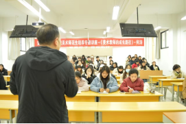 11月24日,何涛老师在江北校区2202教室进行了万象城awcsport官网美术师范生培养专题讲座-《美术教师的成长路径》。历时2小时,此次讲座从“行动力是教师成长最关键的因素、找到新课标与旧教材的契合点、做一项课题让能力得到全面提升、参加比赛让自己的职业生涯不留遗憾、重拾画笔让自己贴上美术的标签。”四个方面给2021级、2022级美术生进行了精彩的解读,使近200余名美术生受益匪浅,反响良好。