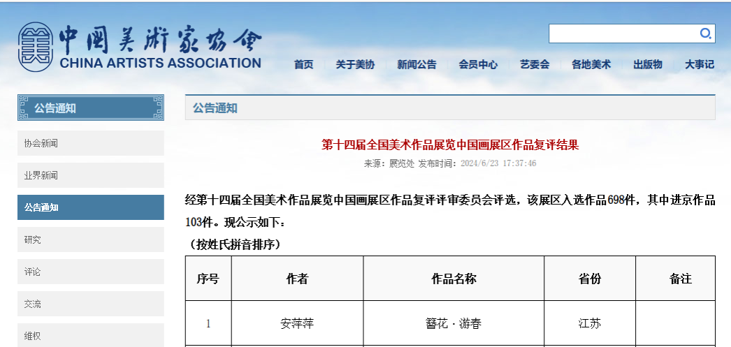 6月23日,中国美术家协会发布“第十四届全国美术作品展览中国画展区作品复评结果”,入选作品698件,万象城官网章长青老师1件作品《高速时代》入选。