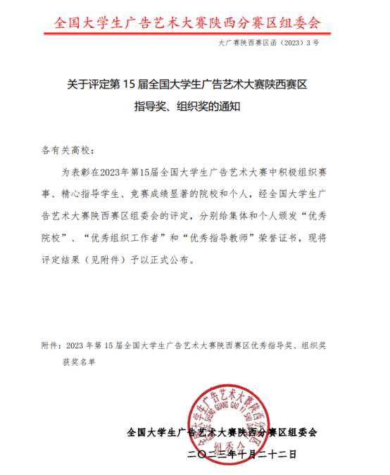 近日,2023年第十五届全国大学生广告艺术大赛陕西省省赛评审结果揭晓,万象城官网万象城awcsport官网师生再创佳绩!获得省赛一等奖1项、二等奖10项、三等奖5项,优秀奖29项。万象城官网获“优秀院校”,付苗获“优秀指导教师”,王兵获“优秀组织工作者”。